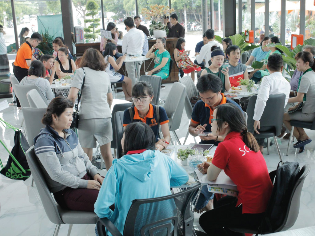 Nhân viên kinh doanh tư vấn nhiệt tình, thân thiện, giải đáp mọi thắc mắc cho khách hàng tại sa bàn dự án.